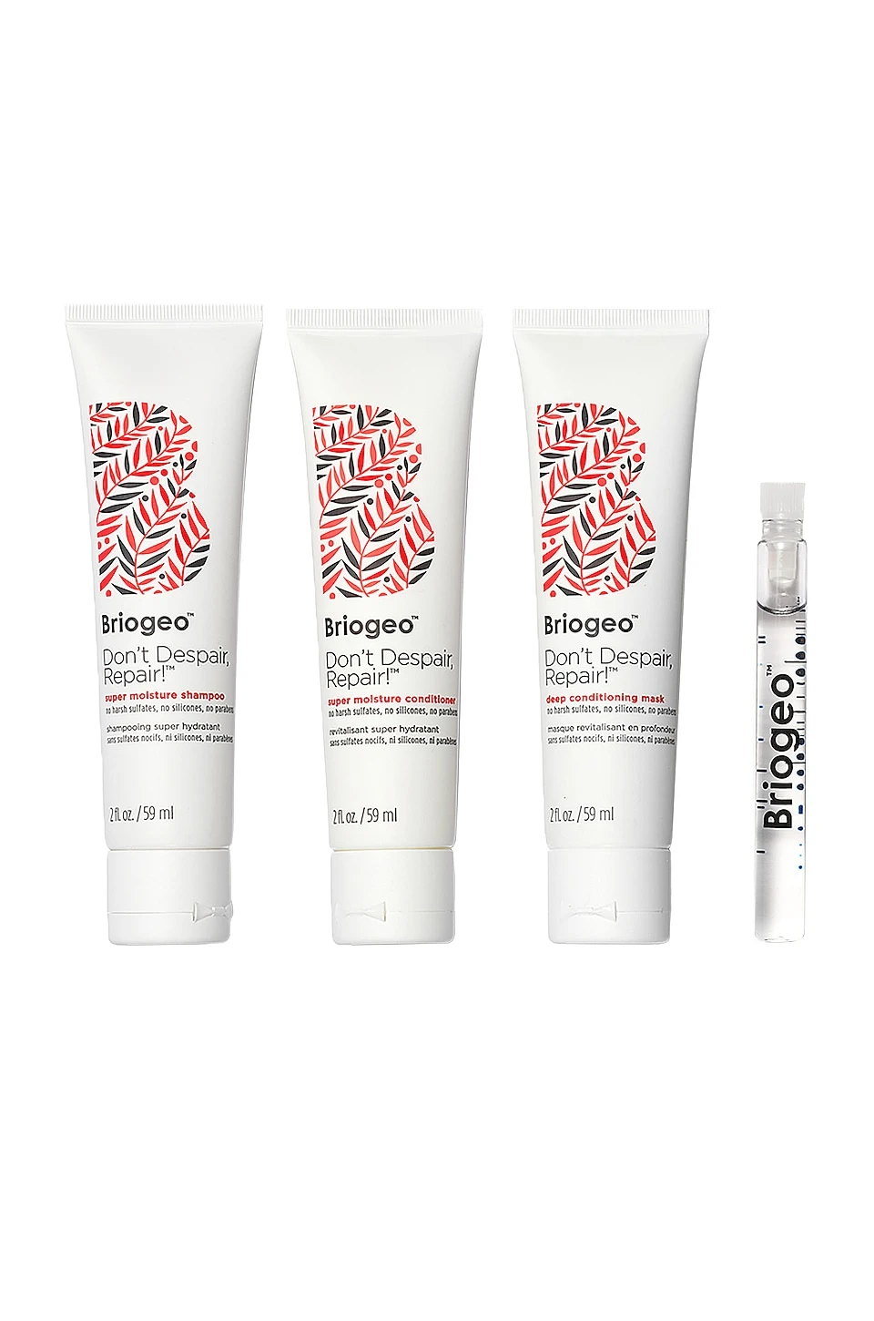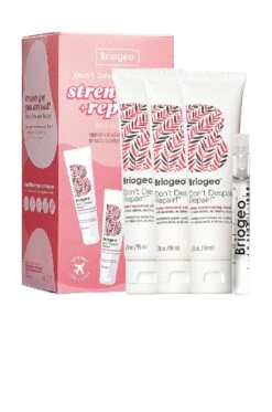 Get healthy hair on the go. Don’t Despair, Repair! Strengthening Travel Kit contains deluxe minis with everything you need to strengthen and repair dry, damaged strands. At work are fortifying ingredients like Ceramides, Rosehip Oil, Almond Oil, Algae Extract, and B Vitamins. Super Moisture Shampoo and Super Moisture Conditioner help strengthen damaged hair and prevent future breakage. Briogeo’s award-winning Deep Conditioning Mask is clinically proven to decrease breakage after two uses, boost hair’s strength, shine, and silkiness, and promote long-term hair health. Complete your healthy hair routine with the Strengthening Treatment Oil, which works to restore moisture, strengthen hair, and seal the cuticle. Includes: 1 x Don’t Despair, Repair! Super Moisture Shampoo (2 oz/ 59 ml), 1 x Don’t Despair, Repair! Super Moisture Conditioner (2 oz/ 59 ml), 1 x Don’t Despair, Repair! Deep Conditioning Mask (2 oz/ 59 ml), 1 x Don’t Despair, Repair! Strengthening Treatment Oil (0.7 oz/ 2.07 ml)