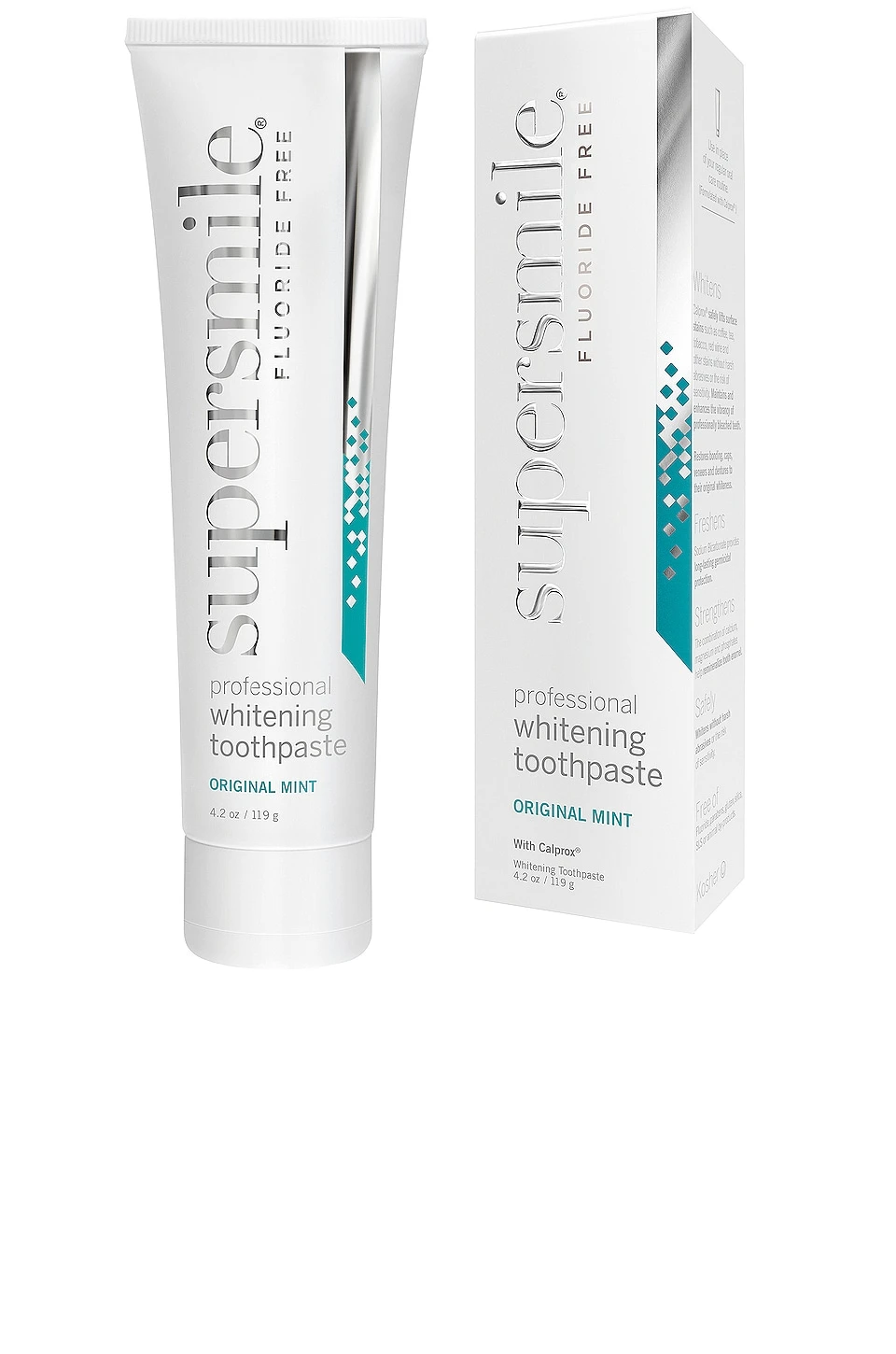 Formulated using unprecedented science, supersmile’s Fluoride Free Professional Whitening Toothpaste features a proprietary formula of encapsulated calcium peroxide and minerals to whiten teeth up to six shades. Developed to be 75% less abrasive than the ADA limit, this bestselling toothpaste contains Calprox to safely and effectively lifts surface stains such as coffee, tea, tobacco and red wine without the risk of sensitivity. Calcium, magnesium, and phosphates remineralize and restore enamel while fighting cavities, resulting in a brighter, healthier smile.