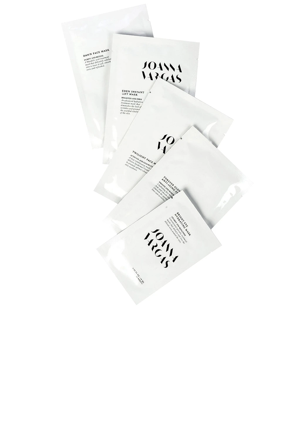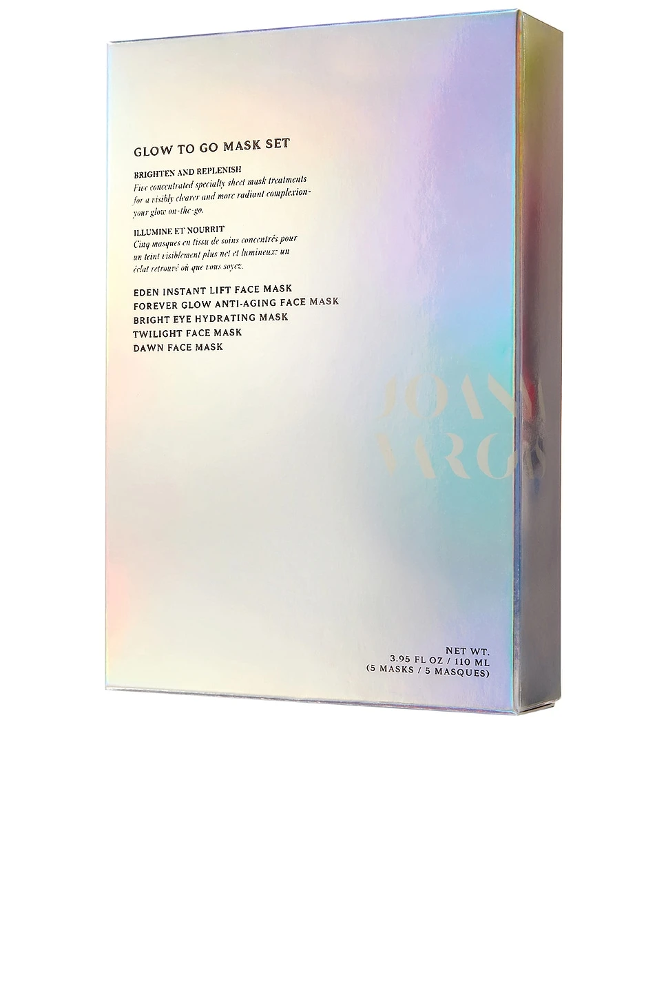 Joanna Vargas’ Glow-to-Go Mask Set features five concentrated specialty sheet mask treatments for a visibly clearer and more radiant complexion your glow on-the-go.Eden Instant Lift Face Mask: An advanced hydration treatment sheet mask that diminishes the appearance of wrinkles and promotes the youthful vitality of the skin.Forever Glow Anti-Aging Face Mask: Formulated to firm and smooth skin, it instantly hydrates the skin and diminishes the appearance of fine lines and wrinkles. Infused with metabolism-boosting and antioxidant-rich ingredients, this bamboo sheet mask strengthens collagen and increases circulation to deliver flawless, radiant skin.Dawn Face Mask: Formulated with Mandelic Acid, this multi-tasking bamboo sheet mask improves texture and reduces the appearance of wrinkles. It gently exfoliates, clears congestion and balances moisture levels to reveal smooth, glowing skin.Twilight Sheet Mask: Deep conditions and delivers Epidermal Growth Factor to promote optimal vibrancy and skin resilience. Made with bamboo, this sheet mask is a perfect post-peel or laser treatment to alleviate temporary redness.Bright Eye Hydrating Face Mask: A concentrated specialty bamboo sheet mask that hydrates the delicate area around the eyes. This ultra-luxe treatment reverses signs of aging and reduces the appearance of expression lines to deliver an even-toned and more firm finish around the eye area.