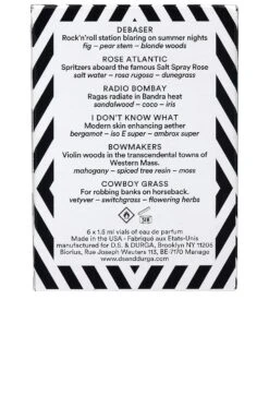 Introduce yourself or a friend to D.S. & DURGA’s top jams from over the years housed in a sleek situation you can carry anywhere. Includes 1.5ml sample vials of BOWMAKERS, COWBOY GRASS, DEBASER, IDKW, RADIO BOMBAY, and ROSE ATLANTIC.