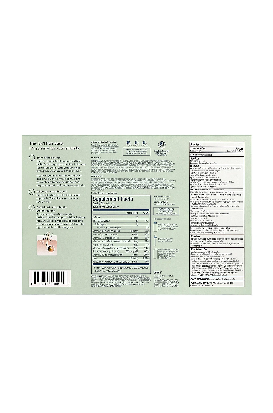 hers triple threat system is packed with a fab four collection of products to help regrow hair, promote thicker-looking strands, and strengthen your locks. Each kit contains hers triple threat Shampoo and hers triple threat Conditioner to clean and hydrate, Minoxidil 2% topical solution to promote regrowth, and yummy cherry- flavored Biotin Gummies to support healthy hair, skin, and nails.