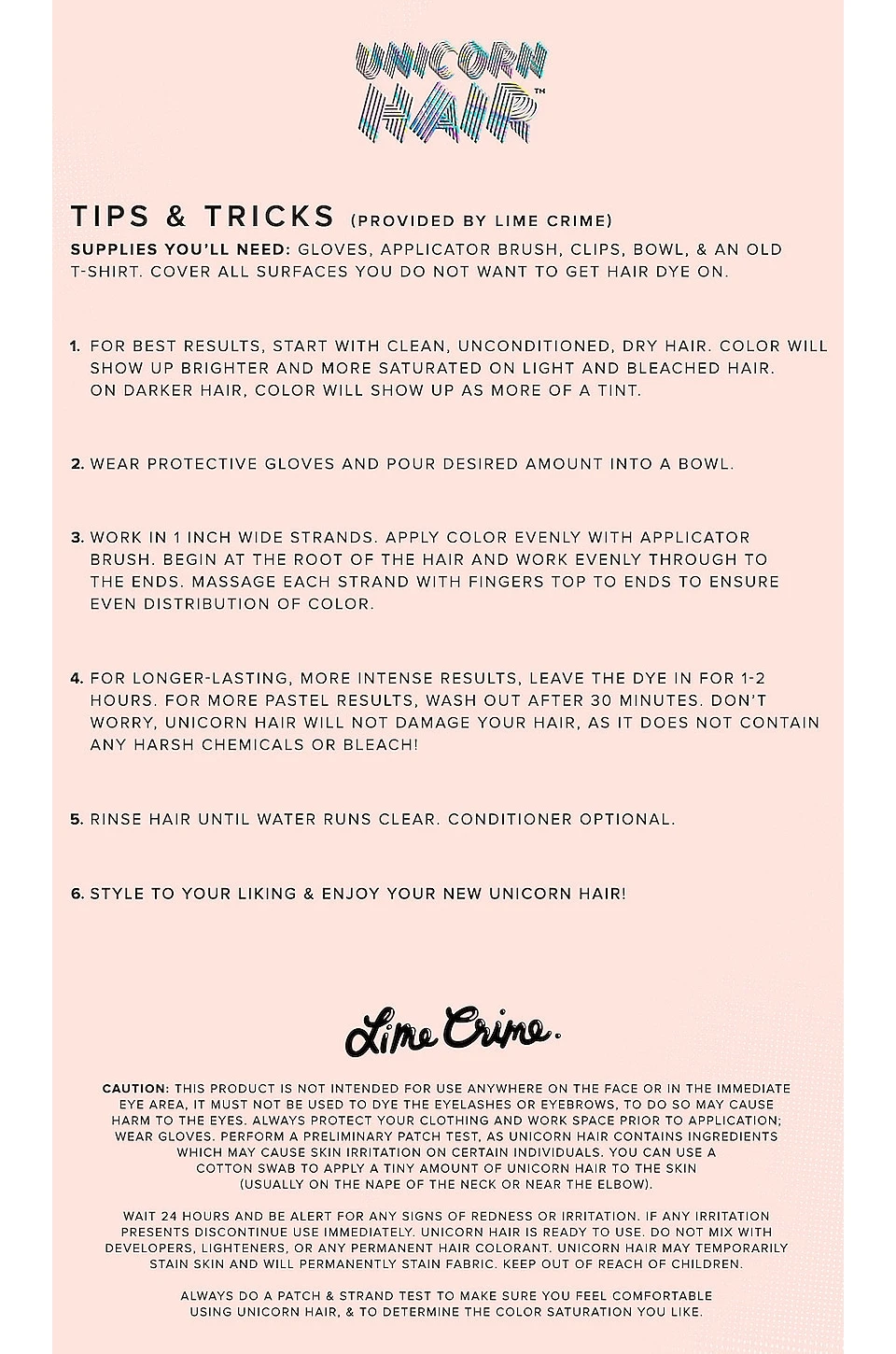 Unicorn mermaid vibes: achieved. Say hello to Lime Crime’s Unicorn Hair. This semi-permanent vegetable dye formula is made with only the purest vegan ingredients and delivers high-impact color that lasts long and fades with grace.